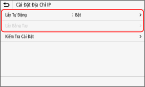Thông thường, đặt thành [DHCP]. Tuy nhiên, khi [DHCP] được đặt trong môi trường mà DHCP không thể sử dụng, máy sẽ tiếp tục xác nhận Lấy Tự Động trong mạng, tạo ra giao tiếp không cần thiết. Khi không sử dụng DHCP, đặt mục này thành [Tắt].