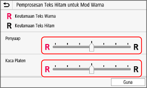 Di [Penyuap] atau [Kaca Platen], jalankan penyesuaian dengan keutamaan yang diberikan untuk menghasilkan semula teks warna atau teks hitam.