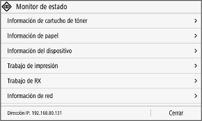Utilice esta pantalla para comprobar la información del equipo, el uso y los registros, las opciones de red y la información de error. También puede usarla para extraer dispositivos de memoria USB del equipo.