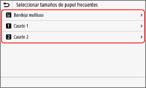 Aparece la pantalla [Seleccionar tamaños de papel frecuentes].