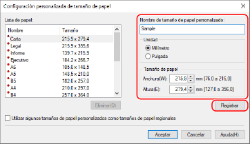 Introduzca el nombre del papel de tamaño personalizado y el tamaño del papel, y haga clic en [Registrar].