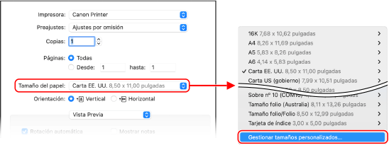 En [Tamaño del papel] de las opciones de impresión, seleccione [Gestionar tamaños personalizados].