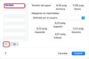 Haga clic en [+] en la parte inferior izquierda, haga doble clic en [Sin título], e introduzca el nombre del papel de tamaño personalizado.