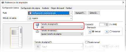 En [Tamaño de página] en la pestaña [Configuración básica], seleccione el tamaño de papel del documento.