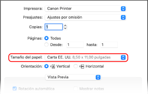 En [Tamaño del papel] de las opciones de impresión, seleccione el tamaño de papel del documento.