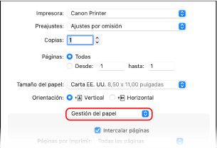 1 | En el menú emergente de opciones de impresión, seleccione [Gestión del papel]. |