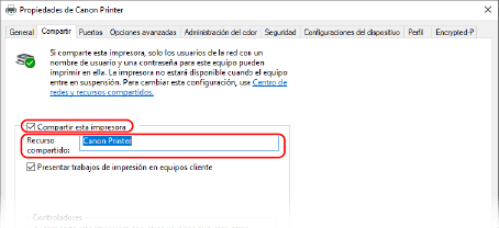 En la pestaña [Compartir], seleccione la casilla [Compartir esta impresora], e introduzca el nombre compartido.
