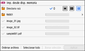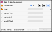 Inserte el dispositivo de memoria USB en la máquina, y en la pantalla [Inicio], pulse [Imp. desde disp. de mem.] para mostrar los archivos y carpetas del dispositivo de memoria USB.