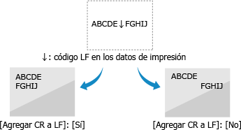 Seleccione si desea añadir un retorno de carro (CR) cuando la máquina recibe un código de avance de línea (LF). Si se selecciona [Sí], la posición de impresión se desplazará al principio de la línea siguiente cuando la máquina reciba un código LF. Si se selecciona [No], la posición de impresión se desplazará a la línea siguiente justo debajo del código LF recibido. |