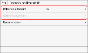 1 | Pulse [Obtención automática]. Aparece la pantalla [Opc. dir. IP (Obtención automática)]. |