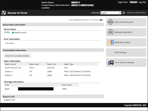 When you log in to Remote UI, the Portal page (Remote UI top page) appears. From here you can check the operations status of the machine, view various information, and change the settings with button operations.