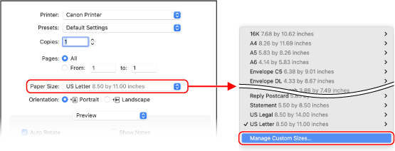 In [Paper Size] of the print options, select [Manage Custom Sizes].