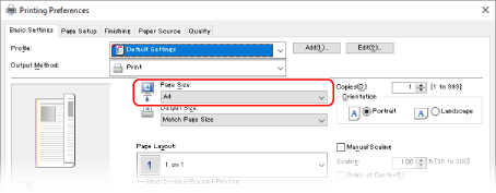 In [Page Size] on the [Basic Settings] tab, select the paper size of the document.