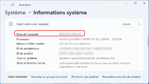 Le nom de l'ordinateur est affiché dans [Spécifications de l’appareil].