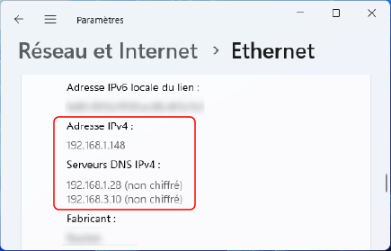 2 | L'adresse IP et le serveur DNS sont affichés dans [Propriétés]. |