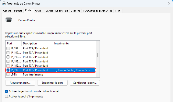 Dans l'onglet [Ports], vérifiez que la case [Activer la gestion du mode bidirectionnel] est cochée.