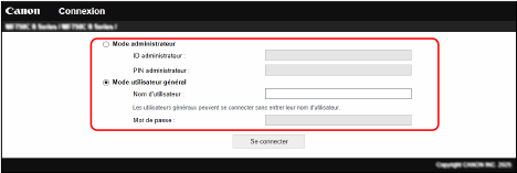 Sélectionnez [Mode administrateur] ou [Mode utilisateur général], puis saisissez les éléments requis en fonction du paramétrage utilisé.