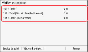 Opérations disponibles sur l'écran de vérification du compteurAppuyez sur [Service de suivi] pour vérifier la connexion au serveur de suivi. Exécutez cette opération pour envoyer régulièrement les informations de l'appareil au serveur de suivi. Appuyez sur [Vér. conf. périph.] pour vérifier la configuration des équipements en option installés sur l'appareil.