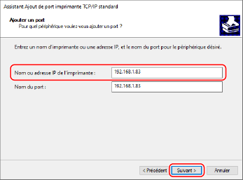 3 | Saisissez l’adresse IP ou le nom DNS (nom d’hôte), puis cliquez sur [Suivant]. Le nom du port est saisi automatiquement. Modifiez-le si nécessaire. Lorsque [Informations supplémentaires requises concernant le port] s’affiche Prenez les mesures nécessaires en suivant les instructions qui s’affichent à l’écran. Pour régler [Type de périphérique], sélectionnez [Canon Network Printing Device with P9100] dans [Standard]. |