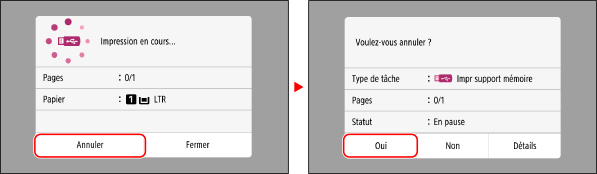 Pour annuler l’impression lors de l’utilisation de l’impression depuis un support mémoire, utilisez le panneau de commande ou l’interface utilisateur distante.(Modèle à écran tactile).