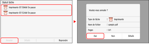 Sélectionnez la tâche à annuler dans [Statut tâche impr.], appuyez sur