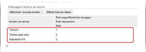 Vous pouvez afficher le nombre de pages imprimées avec chaque ID de service lorsque la gestion par ID de service est activée.