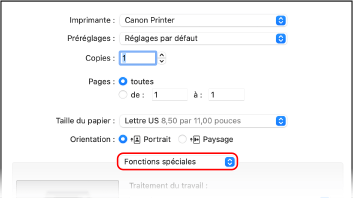 2 | Dans le menu contextuel des options d'impression, sélectionnez [Fonctions spéciales]. Si les options d’impression ne s’affichent pas, cliquez sur [Afficher les détails] dans la boîte de dialogue d’impression. |