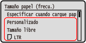 Si necesita cambiar con frecuencia el papel que se va a cargar, configure esta opción como [Tamaño libre]; esto reducirá el número de pasos necesarios para cambiar el ajuste cada vez. También puede mostrar un mensaje de error cuando el ajuste del controlador de la impresora sea significativamente diferente del tamaño del papel cargado.