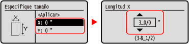 2 | Introduzca los valores en [X] y [Y] y pulse [Aplicar]. Seleccione [X] o [Y], e introduzca la longitud de cada lado utilizando [+] y [-] con  /  para mover el cursor entre los dígitos para introducir números enteros y fracciones. Si se registran tamaños no estándar de uso frecuente, puede recuperarlos pulsando de [S1] a [S3]. |