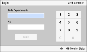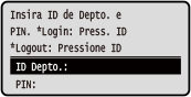 Quando o Gerenciamento de ID de Departamento está configurado, a seguinte tela de login é exibida. Insira a ID do Departamento para fazer login. Se um PIN for definido, digite o PIN.