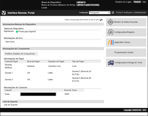 Quando você faz login na UI Remota, a página do Portal (página inicial da UI Remota) é exibida. Daqui, você pode verificar o status das operações da máquina, visualizar várias informações e alterar as configurações de operação dos botões.