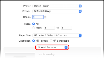 2 | No menu pop-up de opções de impressão, selecione [Special Features]. Se as opções de impressão não forem exibidas, clique em [Mostrar Detalhes] na caixa de diálogo de impressão. |
