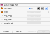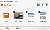 Insert the USB memory device into the machine, and in the [Home] screen, press [Memory Media Print] to display the files and folders in the USB memory device.