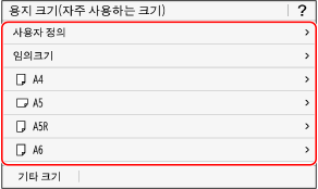 용지를 가로 방향으로 적재하는 경우 [A5]를 선택합니다. 용지를 세로 방향으로 적재하는 경우 [A5R]을 선택합니다.