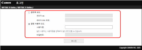 리모트 UI를 사용하려면 기기의 IP 주소를 컴퓨터의 웹 브라우저에 입력하고, 관리자 모드 또는 일반 사용자 모드로 로그인합니다. 리모트 UI로 사용할 수 있는 기능은 로그인한 모드에 따라 다릅니다.