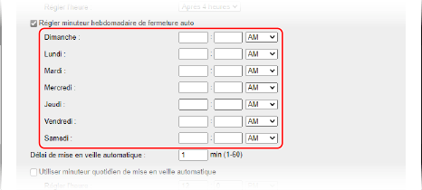 Cochez la case [Régler minuteur hebdomadaire de fermeture auto].