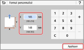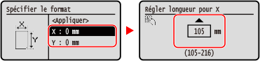 2 | Entrez les valeurs dans [X] et [Y], et appuyez sur [Appliquer]. Lorsque des formats non standard fréquemment utilisés sont enregistrés, vous pouvez les appeler en appuyant entre [S1] et [S3]. |