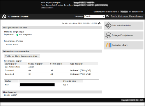 Lorsque vous vous connectez à l'interface utilisateur distante, la page Portail (page d'accueil de l'interface utilisateur distante) s'affiche. Depuis cette page, vous pouvez vérifier l'état d'utilisation de l'appareil, afficher diverses informations et changer les paramètres au moyen de boutons.