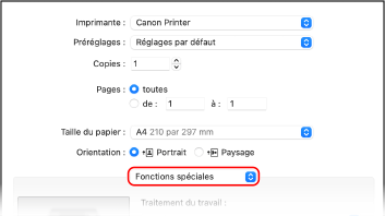 2 | Dans le menu contextuel des options d'impression, sélectionnez [Fonctions spéciales]. Si les options d’impression ne s’affichent pas, cliquez sur [Afficher les détails] dans la boîte de dialogue d’impression. |
