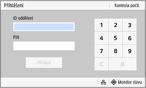 Pokud je nastavena správa ID oddělení, zobrazí se následující přihlašovací obrazovka. Pro přihlášení zadejte ID oddělení. Pokud je nastaven kód PIN, zadejte jej.
