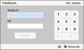 Pēc nodaļu ID pārvaldības iestatīšanas tiek parādīts tālāk redzamais pieteikšanās ekrāns. Ievadiet nodaļas ID, lai pierakstītos. Ja ir iestatīts PIN, ievadiet to.