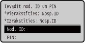 Ja ir iestatīts administratora ID, tiek parādīts pieteikšanās ekrāns darbībām, kurām ir nepieciešamas administratora privilēģijas. Lai pierakstītos, ievadiet administratora ID un PIN.