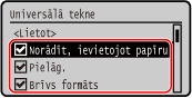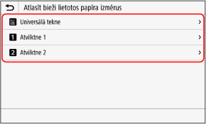 Papīra iestatījumu ekrānā parādīti reģistrētie bieži lietotie papīra formāti. Ja tiek parādīti nelietoti papīra formāti, varat tos katram papīra avotam paslēpt, lai atvieglotu papīra formāta izvēli.