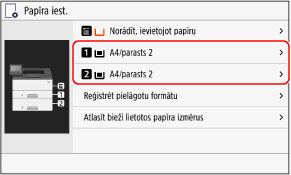 Pēc noklusējuma papīra formāts un papīra atvilktnes tips tiek iestatīts kā A4 un Parasts 2. Ja ievietotā papīra formāts vai veids atšķiras, mainiet papīra iestatījumus.