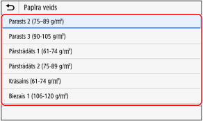 Ja jums ir bieži jāmaina ievietojamais papīrs, izmantojiet opciju [Brīvs] — tādējādi katrā iekārtas lietošanas reizē varēsit mainīt iestatījumu, veicot mazāku skaitu darbību. Tomēr ņemiet vērā, ka šis iestatījums ļauj iekārtai veikt drukāšanu, pat ja printera draivera papīra veida iestatījums neatbilst iekārtā ievietotajam papīra veidam.