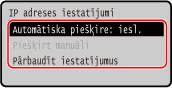 Parasti tas iestatīts kā [Ieslēgt]. Kaut gan prioritāte tiek piešķirta ar DHCP starpniecību piešķirtai IP adresei, ja no DHCP netiek saņemta atbilde, tiek izmantots automātisks IP.