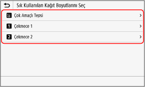 Kağıt ayarları ekranında, kaydedilen sık kullanılan kağıt boyutlarını görüntülenir. Kullanılmayan kağıt boyutları görüntüleniyorsa bunları her bir kağıt kaynağı için gizleyerek kağıt boyutu seçmeyi kolaylaştırabilirsiniz.