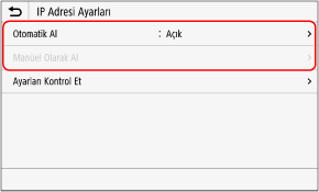 Mevcut Durumda Ayarlı IP Adresini Kontrol Etme3. adımdaki ekranda, mevcut IP adresi ayarını kontrol etmek için [Ayarları Kontrol Et] öğesine basın. IP adresi "0.0.0.0" olarak görüntüleniyorsa doğru şekilde yapılandırılmamış demektir.