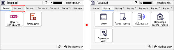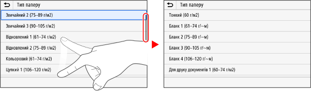 Торкніться екрана та перегорніть його кінчиком пальця. Екран рухається в напрямку гортання. Наприклад, екран [Головний] перегортається на відповідну вкладку в напрямку гортання пальцем.
