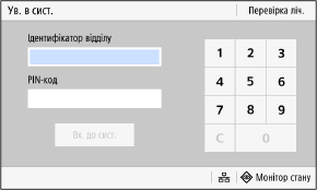 Якщо налаштовано керування ідентифікаторами відділів, відображається наведений нижче екран входу в систему. Введіть ідентифікатор відділу, щоб увійти. Якщо встановлено PIN-код, введіть його.